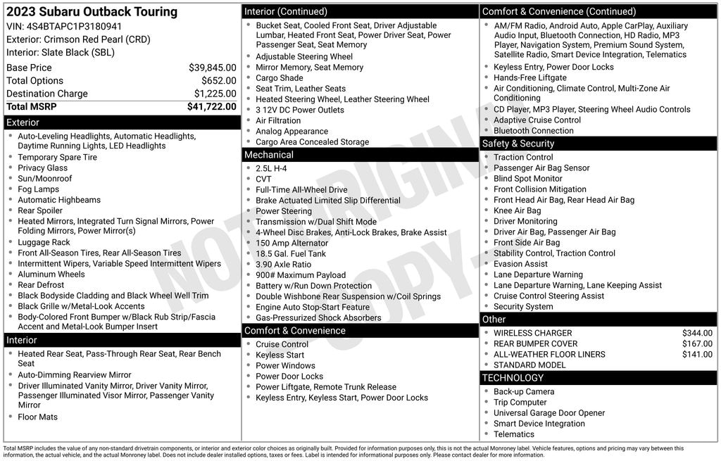 Certified. Crimson Red Pearl 2023 Subaru Outback Touring AWD CVT Lineartronic 2.5L 4-Cylinder DOHC 16V