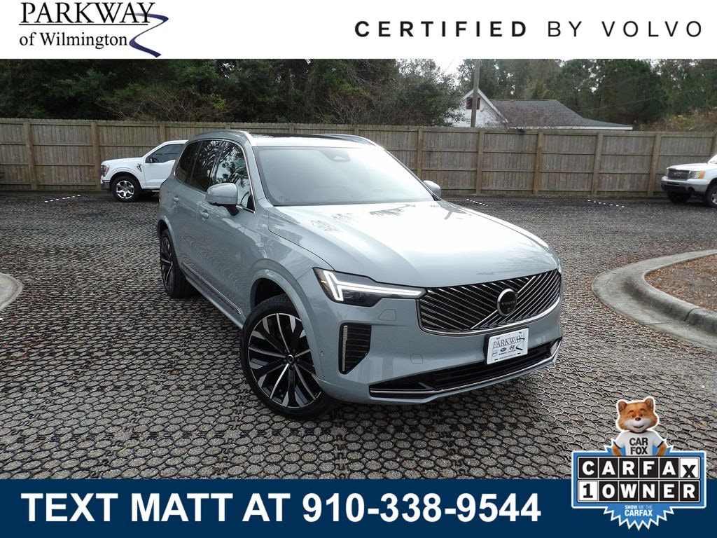 Certified. Vapour Gray Metallic 2025 Volvo XC90 B6 Plus 7-Seater 2025.5 AWD Automatic with Geartronic 2.0L I4 Turbocharged DOHC 16V LEV3-ULEV70 AWD, Cardamom w/Quilted Nordico Upholstery.