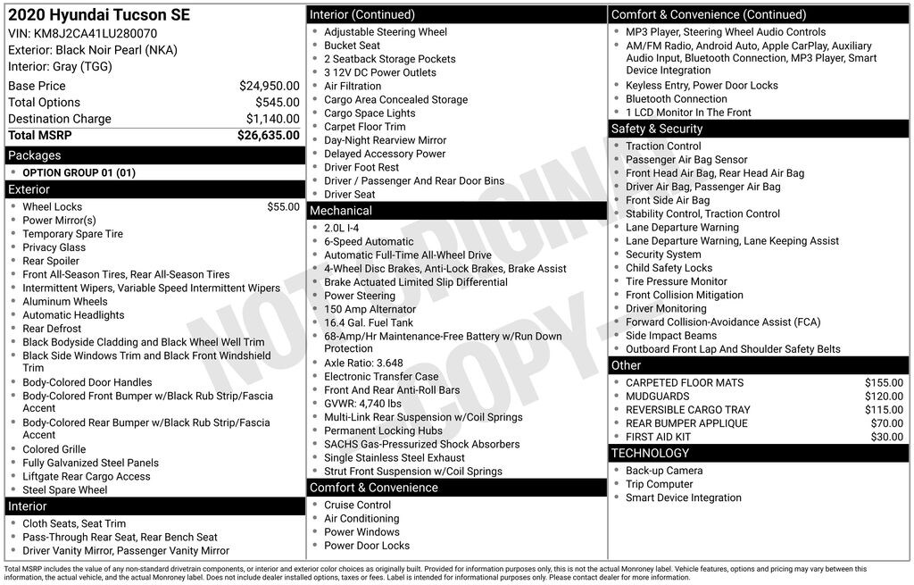 Black Noir Pearl 2020 Hyundai Tucson SE AWD 6-Speed Automatic with Shiftronic I4 AWD.