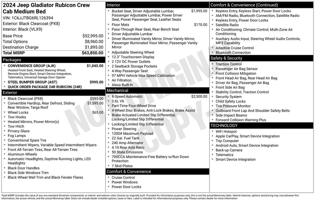 Priced below KBB Fair Purchase Price! Black Clearcoat 2024 Jeep Gladiator Rubicon 4WD 8-Speed Automatic 3.6L V6 24V VVT