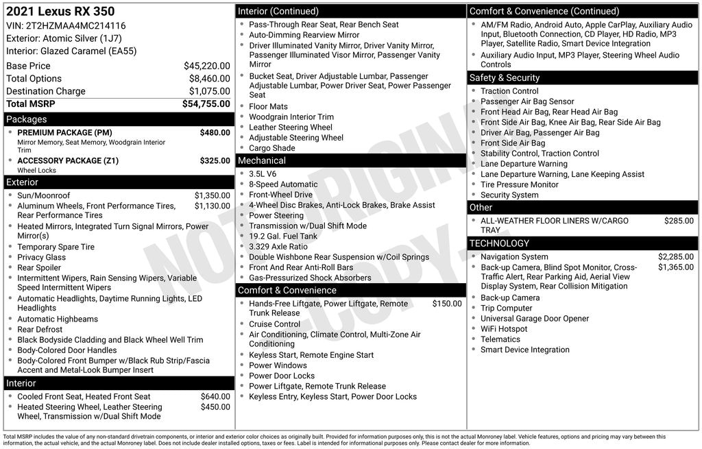 2021 Lexus RX 350 FWD 8-Speed Automatic 3.5L V6 DOHC 24V Glazed Caramel Artificial Leather.