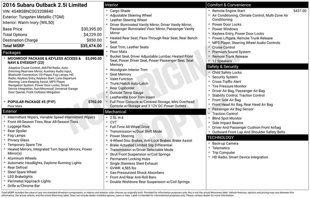 - Moonroof Package & Keyless Access & Navi & EyeSight$3,090