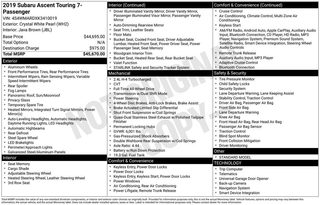 Crystal White Pearl 2019 Subaru Ascent Touring AWD Lineartronic CVT 2.4L DOHC