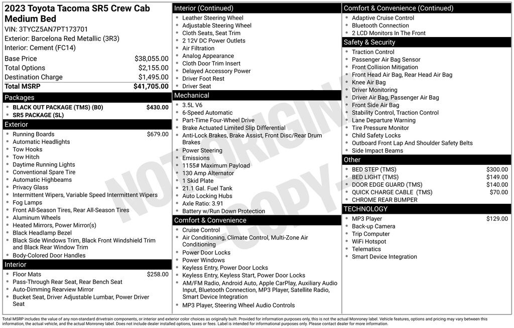 Barcelona Red Metallic 2023 Toyota Tacoma SR5 V6 4WD 6-Speed Automatic 3.5L V6 PDI DOHC 24V LEV3-ULEV70 278hp 4WD.
