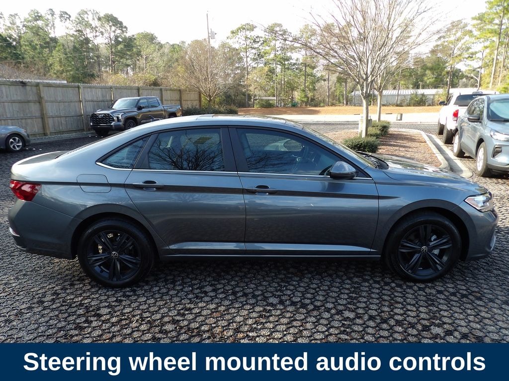 Grey 2023 Volkswagen Jetta 1.5T SE FWD 8-Speed Automatic with Tiptronic 1.5L I-4 DI DOHC Turbocharged Storm Gray w/V-Tex Leatherette Seat Trim, Active Cruise Control, Fully automatic headlights, Power Tilting & Sliding Panoramic Sunroof, Remote Engine Start, Remote Keyless Entry, Steering wheel mounted audio controls.